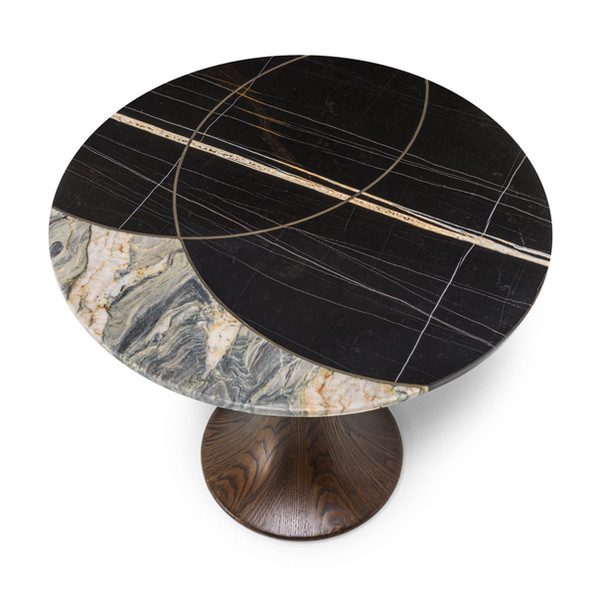This Low table in marble. Marble top in two-tone mosaic with arched design and decorative inserts in polished brass flush with marble. Pedestal base in solid stained ash.Dimensions: Diam: 60 cm Height: 60 cmPrice : on Request